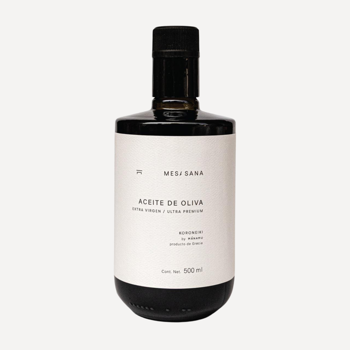Aceite de Oliva Ultra Premium, 100% PURO. NO diluido, mezclado, ni rebajado con otras variedades de aceituna o tipos de aceites. Extraído directamente de las famosas MONOVARIETAL Aceitunas Koroneiki en huertos centenarios en Messinias, Grecia.